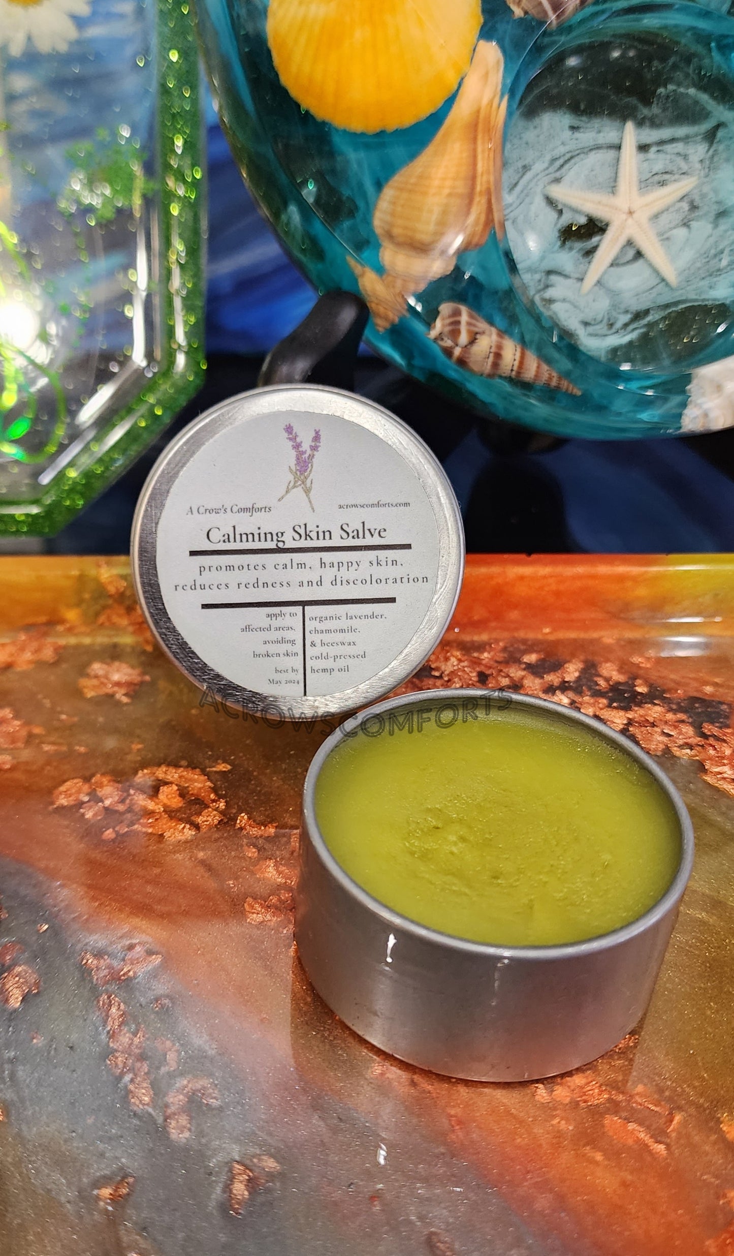 Calming Skin Salve with chamomile and lavender promotes happy skin, prevents dryness, and reduces redness and discoloration. Excellent for sunburn, skin conditions like eczema, psoriasis, acne and relieves those stubborn dry spots! Apply to clean skin with clean hands as often as needed, avoiding broken skin.